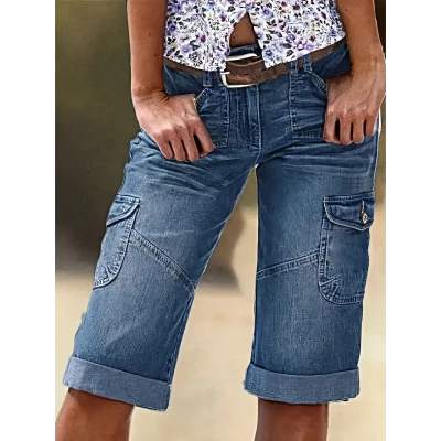 Women's Stretch Denim Shorts with Work Cargo Pockets - Bohemian Style Mid-Length Casual Shorts, Multiple Utility Pockets & Built- Zipper, Machine Washable for Spring/Summer