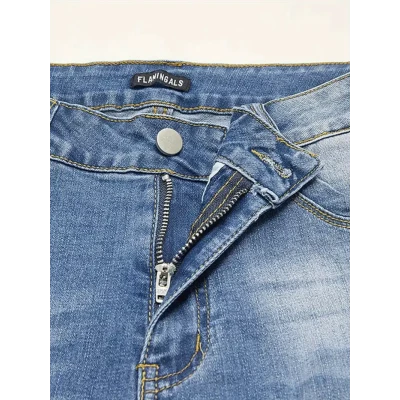 Fashionable women's light blue high-waisted denim shorts with lace trims, functional pockets, comfortable blended fabric