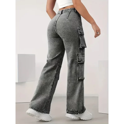 2025 New Style Women'S Leisure Straight-leg Jeans With Laces And Multiple Pockets. Casual Fashion Denim Fabric Sweatpants Jeans Fit Womenswear