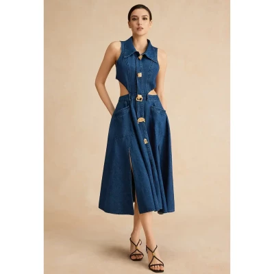 Women's high-rise stretch denim thigh shorts - dark blue, V-shaped ripped detail, elasticated fit