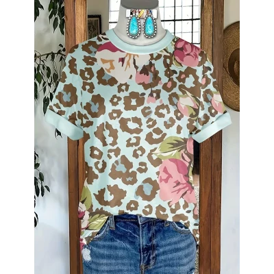 Women'S Casual Summer Leopard And Floral Print Short Sleeve T-Shirt Top